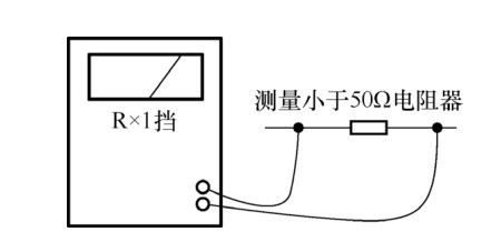 (5)測(cè)量小于50的電阻器。圖5-23是測(cè)量小于50的電阻器的接線示意圖。當(dāng)萬用表放置在電阻 r1中,兩根桿連接到電阻器的兩個(gè)引腳中的任何一個(gè)時(shí),表針應(yīng)偏轉(zhuǎn)到右邊,指向電阻器的標(biāo)稱電阻值,如10電阻器,表針應(yīng)停在刻度盤上的10點(diǎn)處。